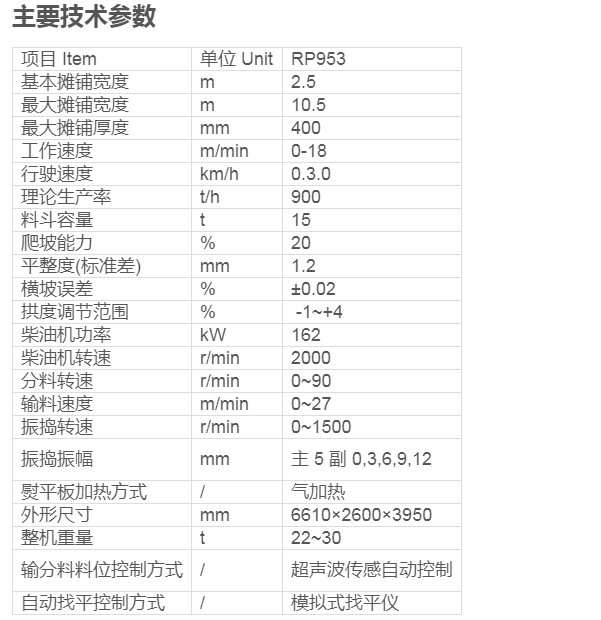 RP953型多功能攤鋪機(jī)是3系列大型攤鋪機(jī)中重要的機(jī)型之一,具有可靠的品質(zhì),超強(qiáng)的施工能力,優(yōu)異的工作性能和較高的性價比,是一種可廣發(fā)應(yīng)用于高速公路基礎(chǔ)和各種等級公路面層材料攤鋪?zhàn)鳂I(yè)的施工設(shè)備。該機(jī)采用全液壓驅(qū)動,微電腦控制,作業(yè)獨(dú)立驅(qū)動,超聲波料位傳感控制,電子自動找平,雙振搗壓實等當(dāng)今世界最先進(jìn)技術(shù),使得該機(jī)具有作業(yè)能力強(qiáng),攤鋪穩(wěn)定性好,供料均勻,預(yù)壓密實高度,路面平整度好,操作簡單舒適,維修方便快捷等優(yōu)點(diǎn)。